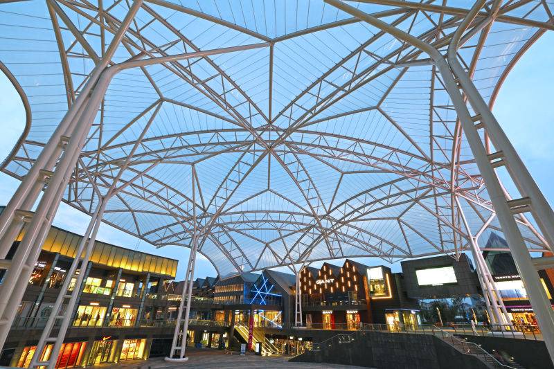 整个项目均使用透明带镀点ETFE膜材,由于ETFE材料强度偏低,单层使用均时配合大量索网约束膜面以补强,平行索间距控制在1.5米以下,索使用总量超过500根,索与单层ETFE膜的配合,让三个膜结构壳顶看起来像干净透明,光线透过,视觉的透过,完美的融合到整体嘉年华的体系中。