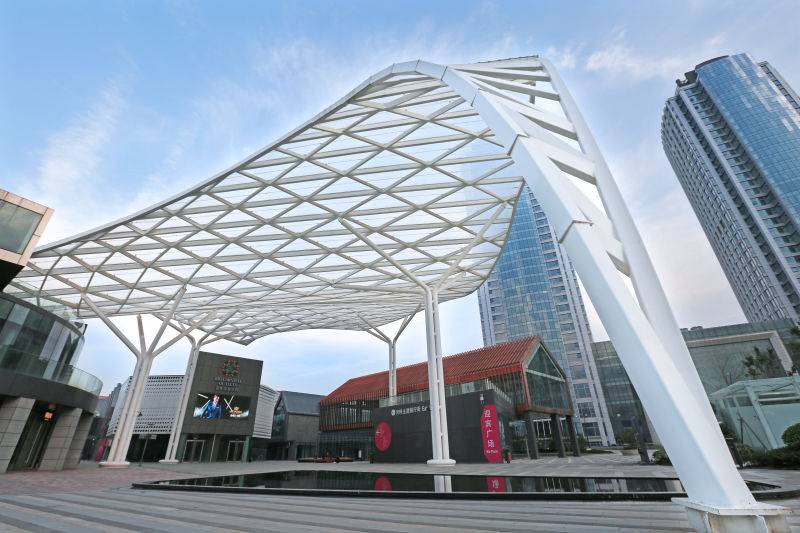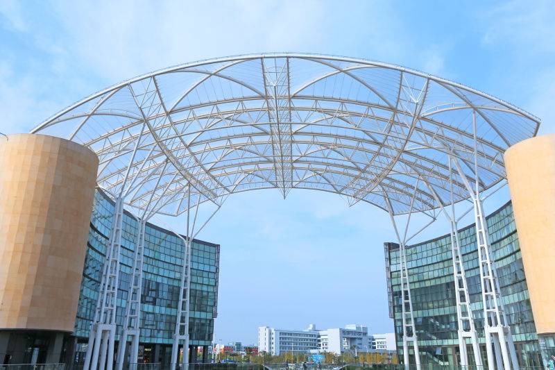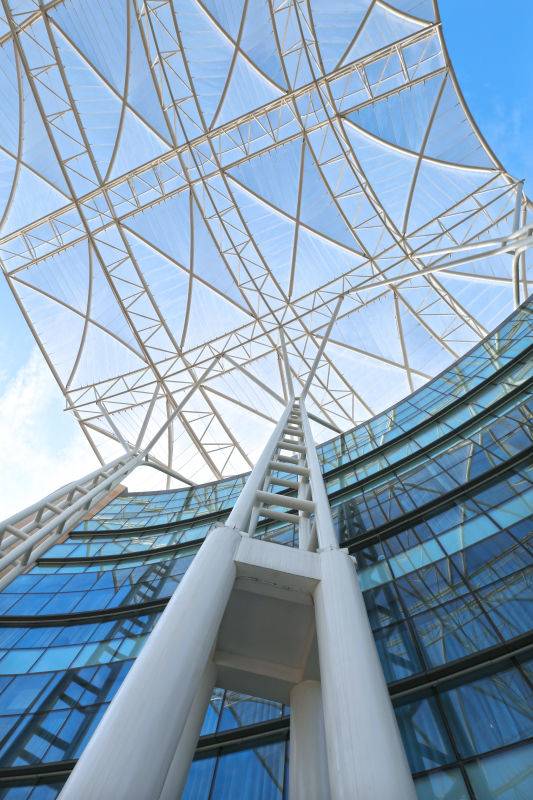 本项目共有ABC三个区独立膜结构壳顶组成。其中A区结构总长66米,总46米,最高24米,屋面由矩形管构成的单层网壳,铺装27片长条状单层ETFE膜单元,单片膜单元最长约46米,宽度约2.5米。B区长宽约80米,由6组格构柱支撑桁架体系构成壳面,壳面最高点约33米,最低点约15米,桁架体系上部铺设大小形状不一的44片单层ETFE膜单元。C区长约67米,宽约52米,由4组格构柱支撑桁架体系构成壳面,壳面最高点约41米,桁架体系上部铺设大小形状不一的48片单层ETFE膜单元。