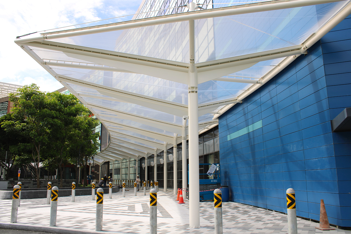 坡面顶篷是对榜鹅新世界国际学校数字校园的重要补充。它被设计成一个独特的弯曲结构,能有效遮蔽主入口大厅、外部人行道和车道之间的区域。单层ETFE的应用方案,不仅可以为行人提供充足的防雨和遮阳,同时还能保持高能见度。