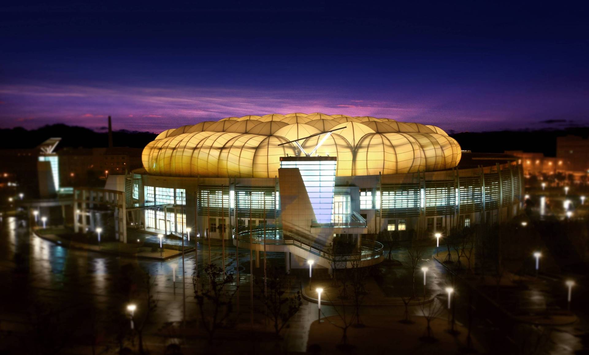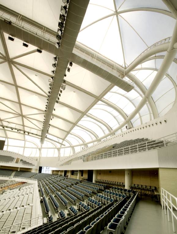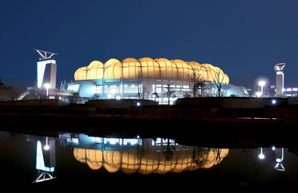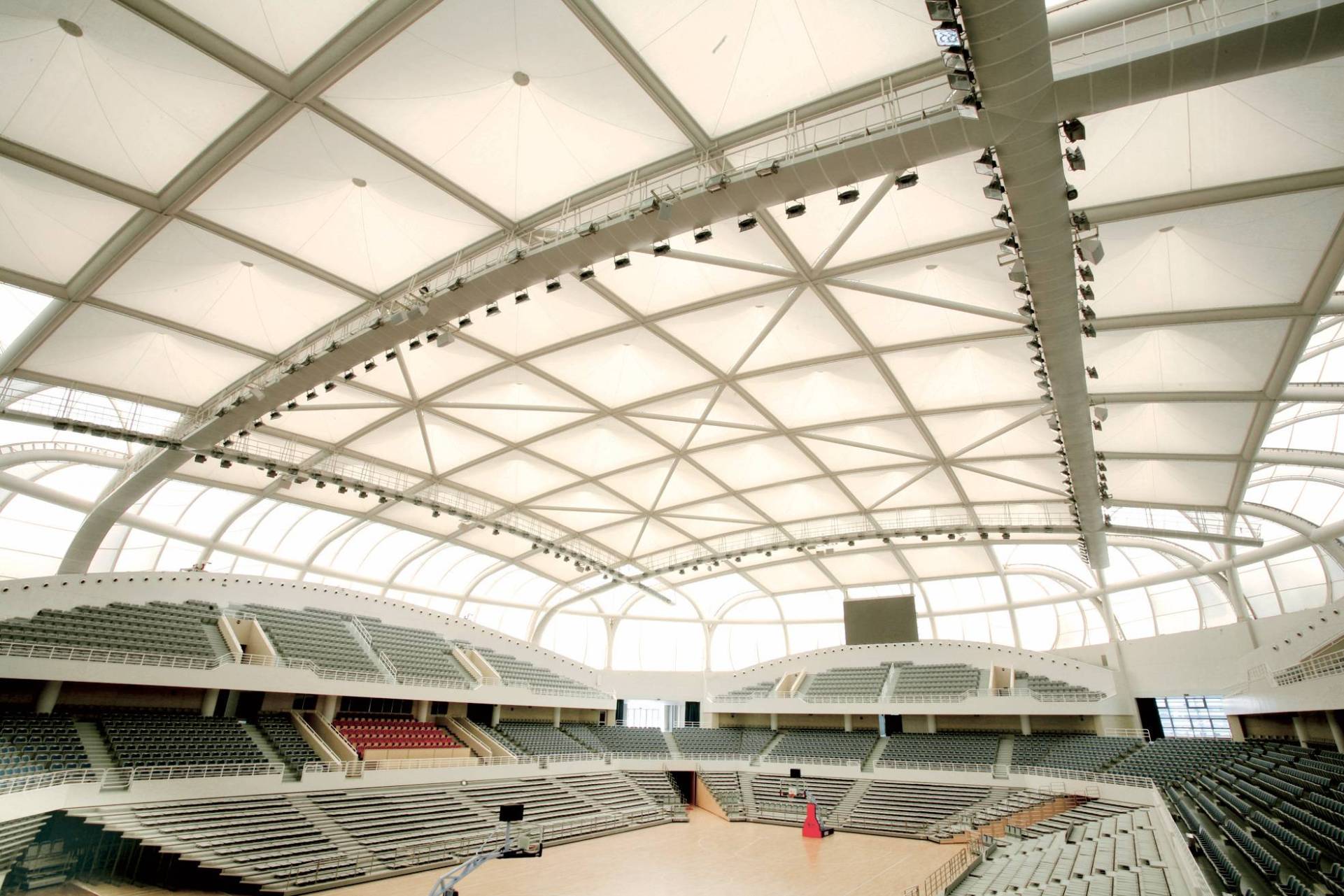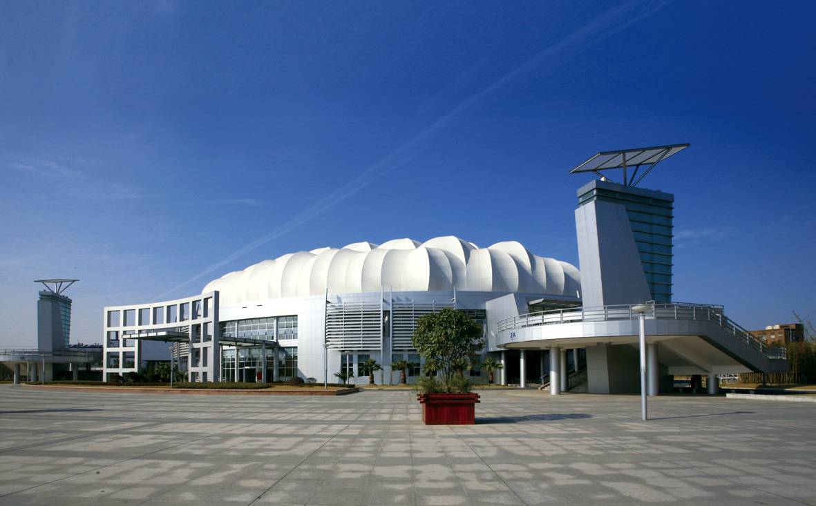 体育馆主体由覆盖双层PTFE的大跨度钢框架外壳构成。外壳平面呈椭圆形,宽90米,宽70米。上海太阳负责张拉膜结构的施工结点设计、制作和安装,包括其索网系统、大跨度施工及PTFE膜屋顶。